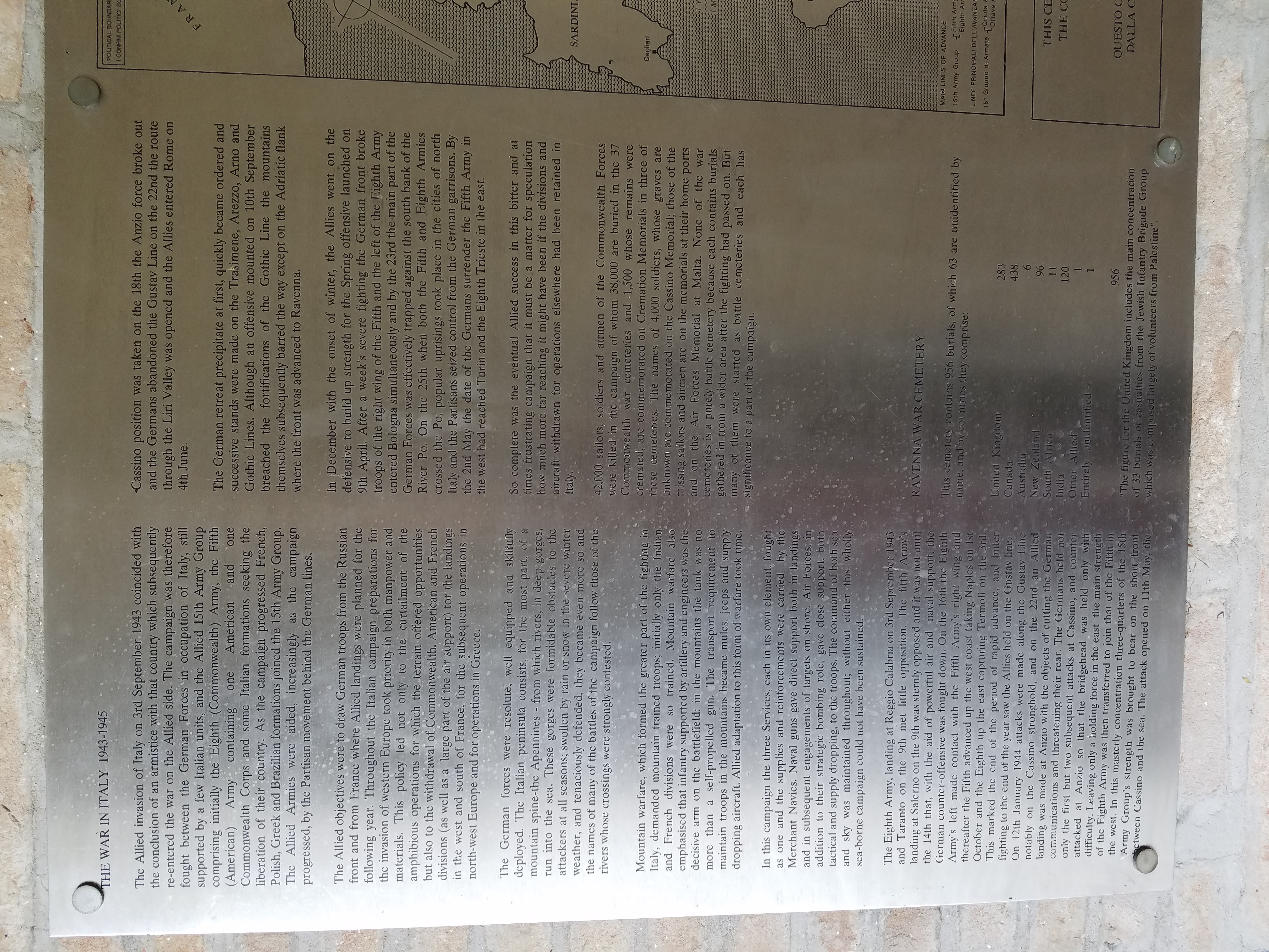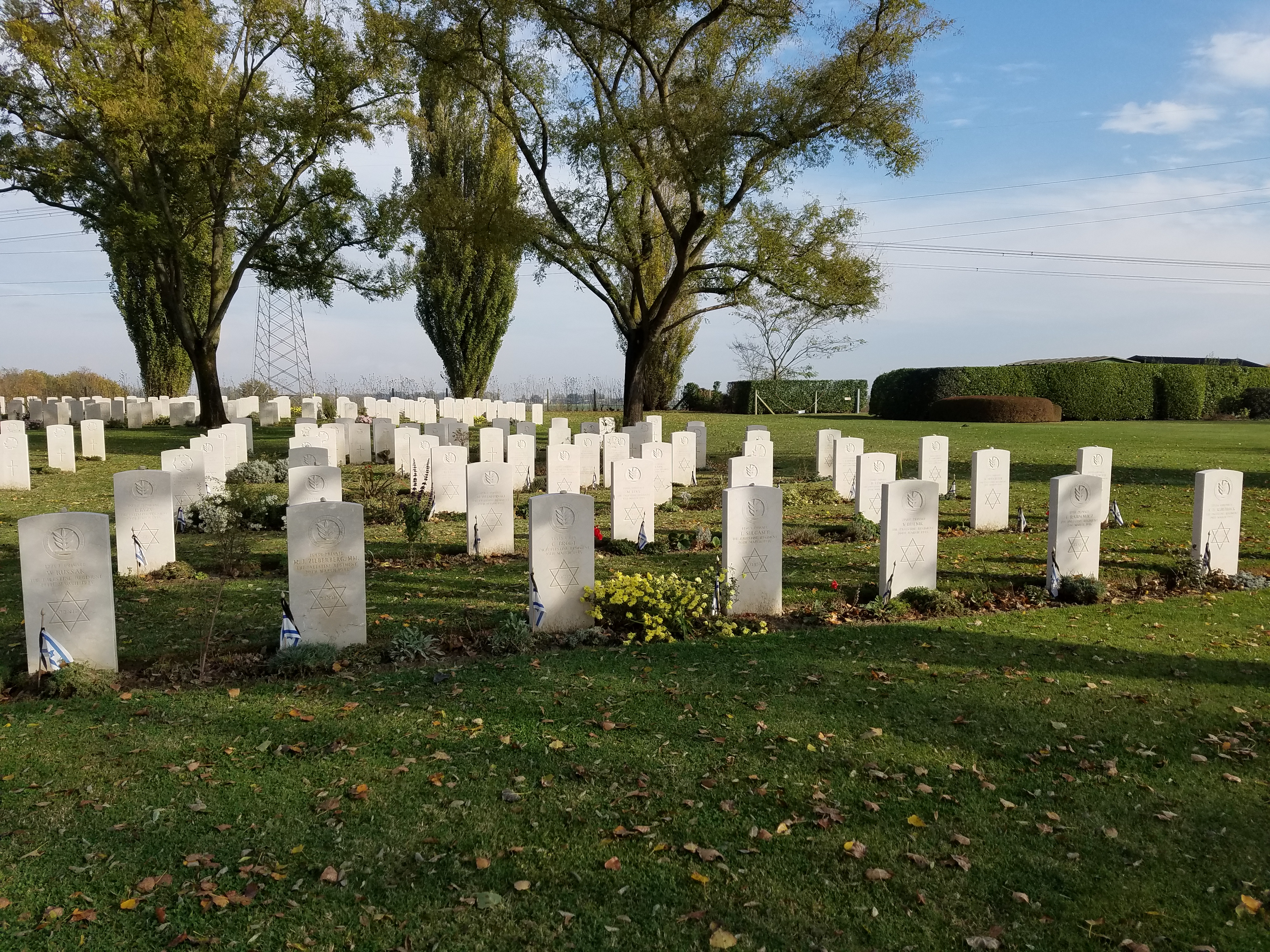 Ravenna War Cemetery (near Piangipani, Ravenna Province, Emilia-Romagna Region, Italy) - WWI and WWII Commonwealth - 11 South Africans, 8 Australians, 33 total burials from WWI; 33 Jewish Brigade, United Kingdom, Indians, Canadians, New Zealanders, 955 total burials from WWII, 63 Unknown.